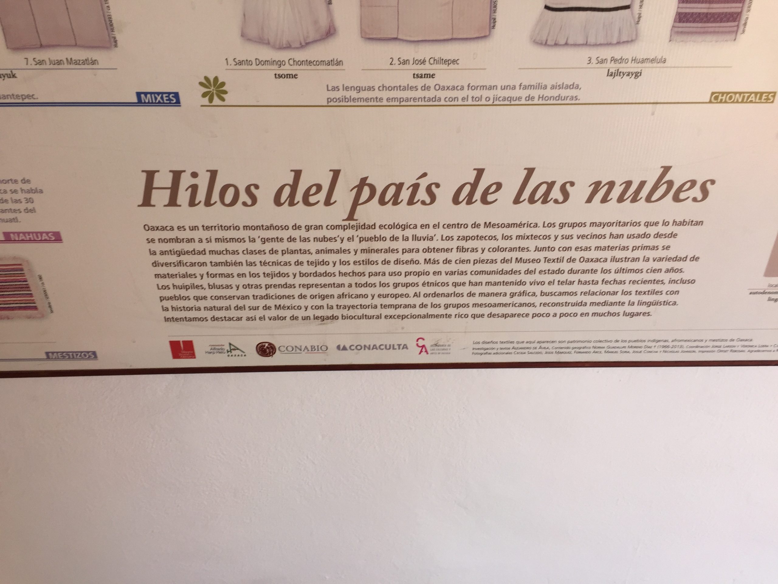 I enjoyed a display showing all the different textiles and clothing styles of “the land of clouds” — Oaxaca.