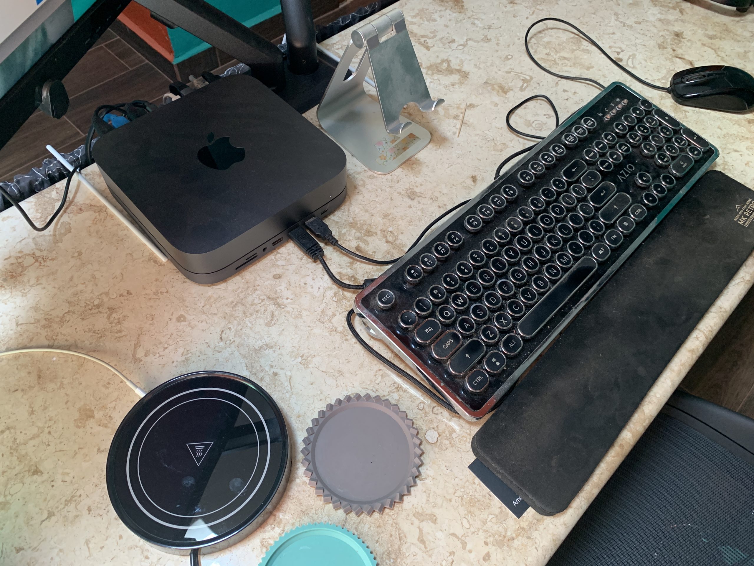 A curtain rod and valance through this little basket is effective at hiding my tangle of cables! The basket holds external hard drives and the bulk of the wires.