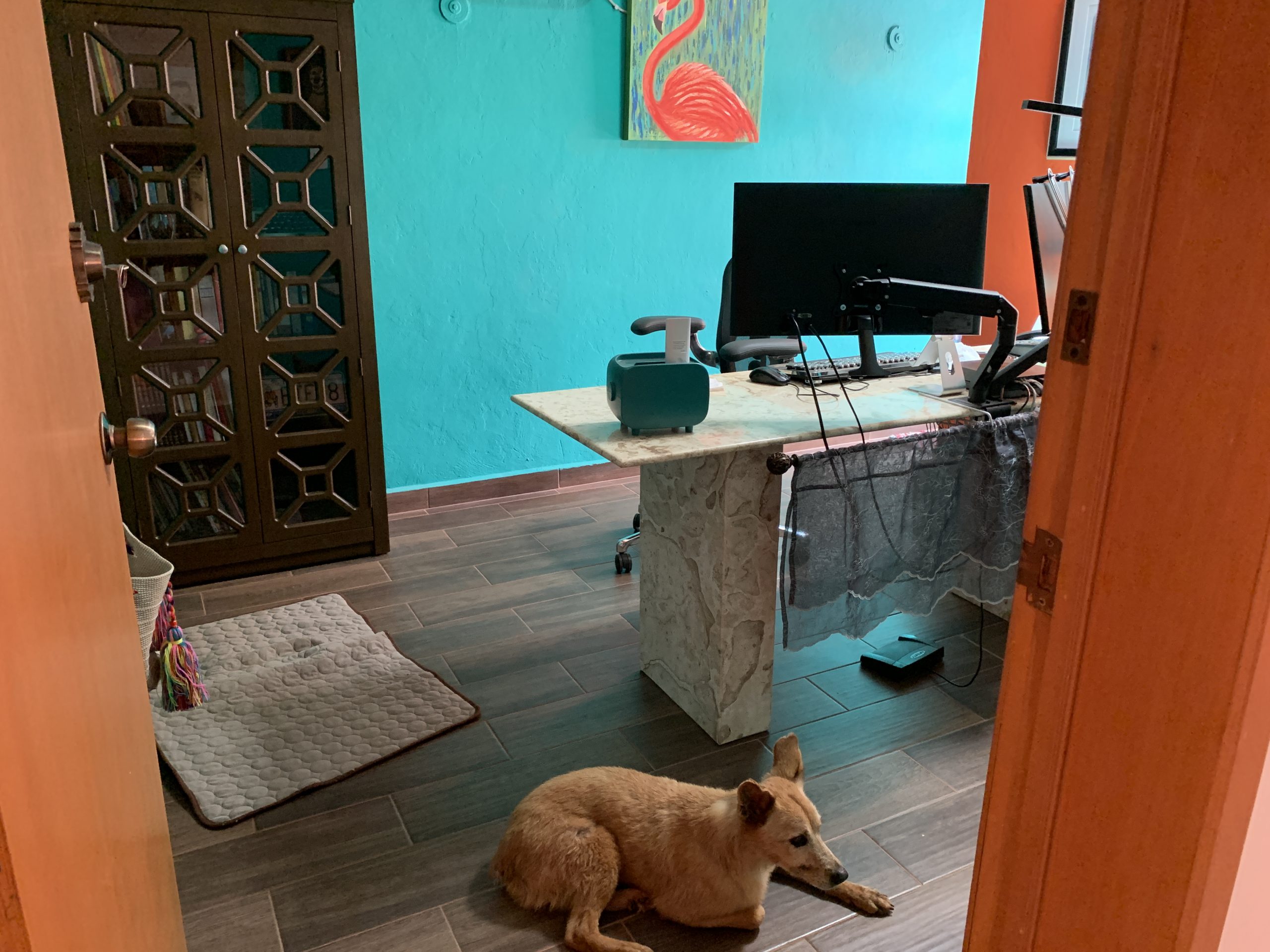 I’ve always wanted a turquoise and orange room, so there was no real decision to be made about the colour scheme of this room! I also wanted a wood-look floor. The solid stone desk, pretty much a gift from my contractor, is a more “luxe” element than I would have let myself dream of (yet so affordable!), but the huge splurge of an Aeron chair by Herman Miller was always factored into the budget. New, grounded outlets to allow for the use of a surge protector were another important element of the room.
