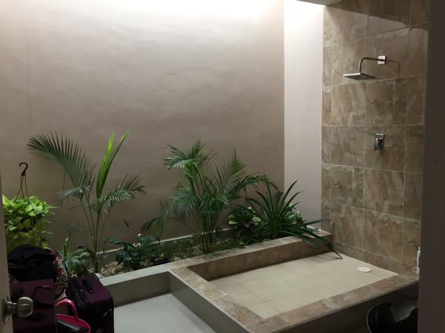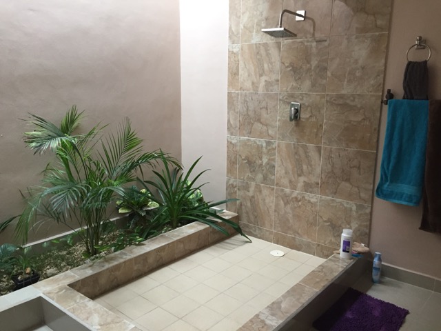 Now, into the bathroom. OMG Yes, this is where I have to shower for the next six months. Do try to be sympathetic. 😉 And, yes, those are real plants!