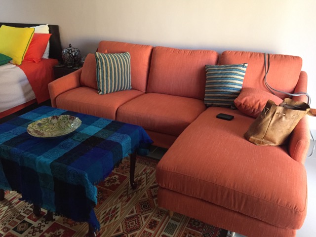 I love the couch. So comfy. Particularly like the chaise longue part for stretching out. Yes, that’s my tablecloth from Maz covering the table. I love the combo of blue and orange so why not?!