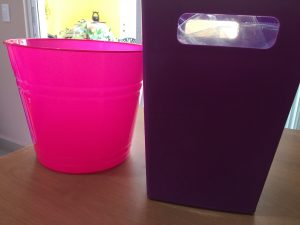 I also wanted a bucket like the pink one I use as a trash can in the office to store the parts for my stick blender, but Bodega was out of them. So I decided to buy the office a new (purple) trash can and move the bucket to the kitchen!