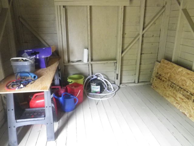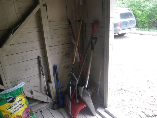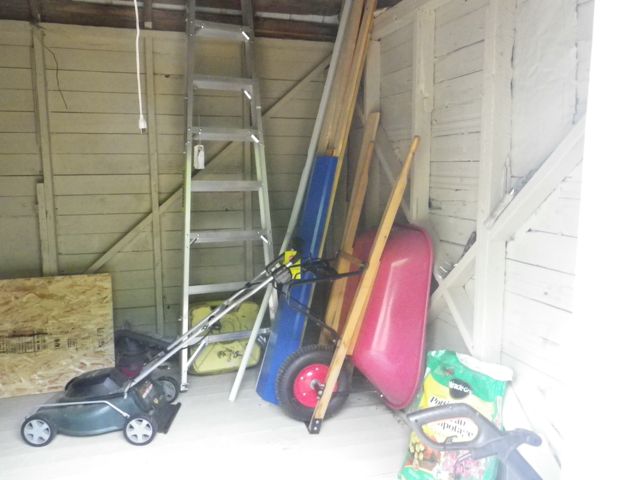Garden tools can fill the north wall (where the wheelbarrow is presently) with hooks or some other system to hang them.