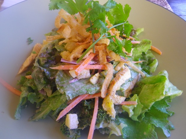 After much hemming and hawing, I ordered what I had last time, their ‘Asian’ chicken salad. Mangos aren’t in season, so they subbed tinned pineapple, which worked! It was a perfect lunch for a hot day. It doesn’t look like much, but there is a whole grilled chicken breast under the greens.