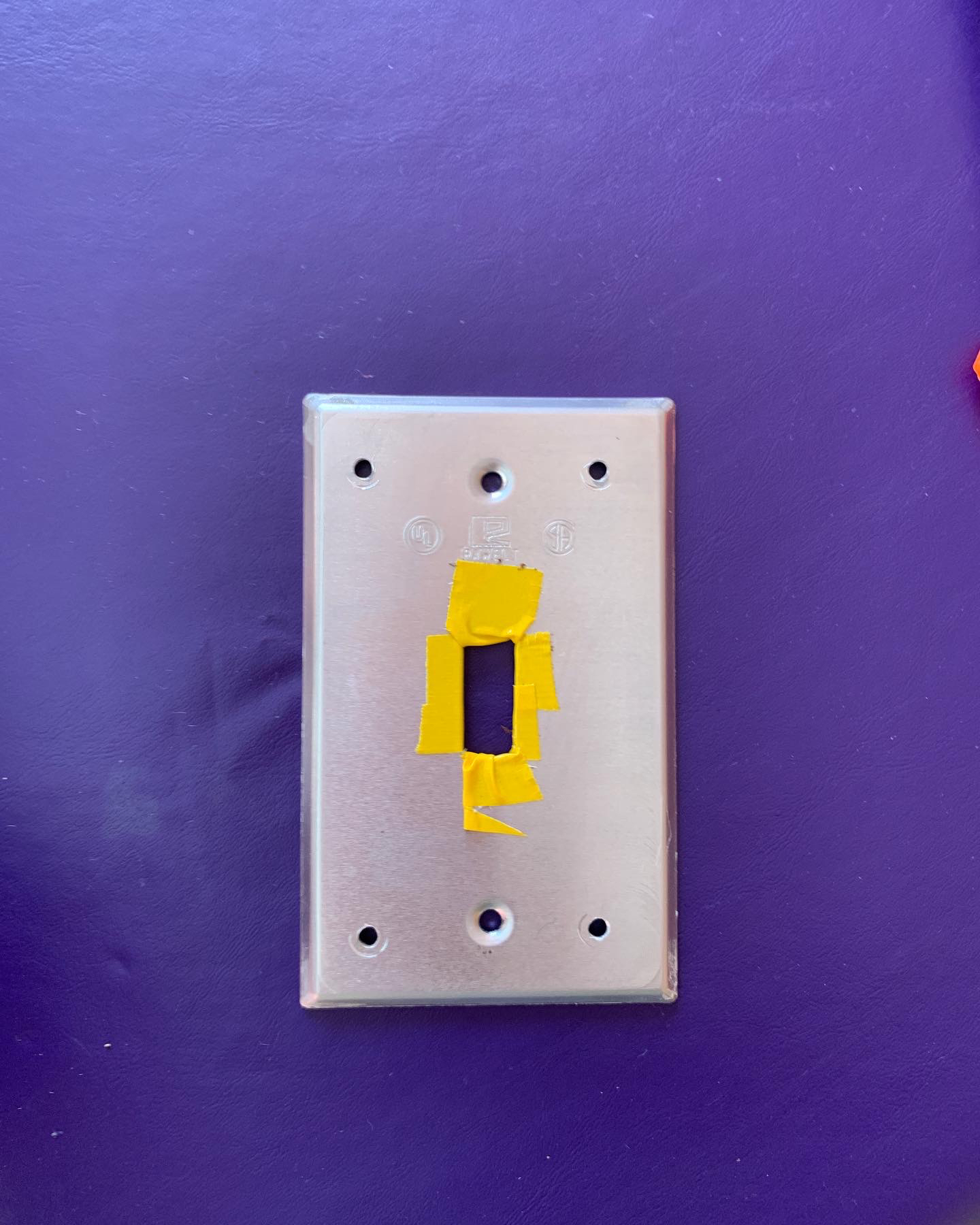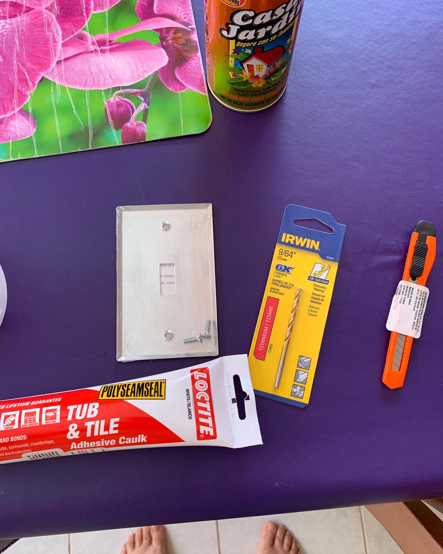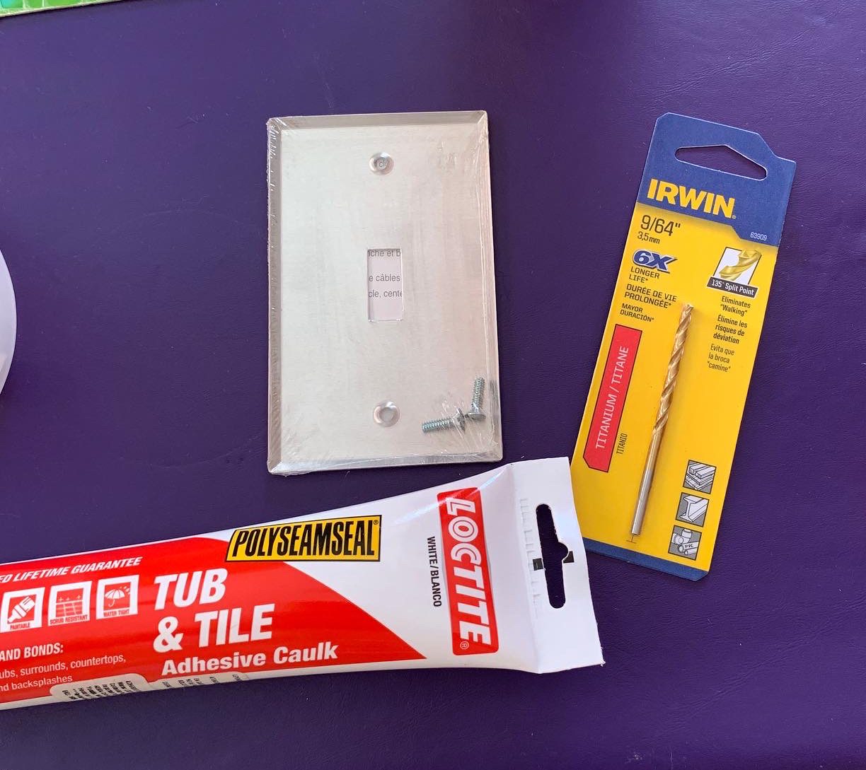 My doorbell wiring was set into a standard electrical junction box. The Ring mounting bracket just covered the hole, but that left nowhere in which to screw the bracket. I had a think about it and then headed out to the closest hardware store open on a Sunday, the Ace Hardware on Calle 60. Had a chat with one of their clerks and he agreed that my plan was a good one — I would install a metal outlet cover with a hole in it for the wires and drill four holes into it in which I could screw the Ring bracket. I made sure to pick up an appropriately sized drill bit and some caulking as well. Looking back, the only thing I would have changed, if I could, would have been the colour of the outlet cover, which I’ll explain in a bit.
