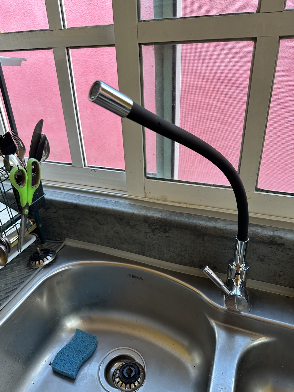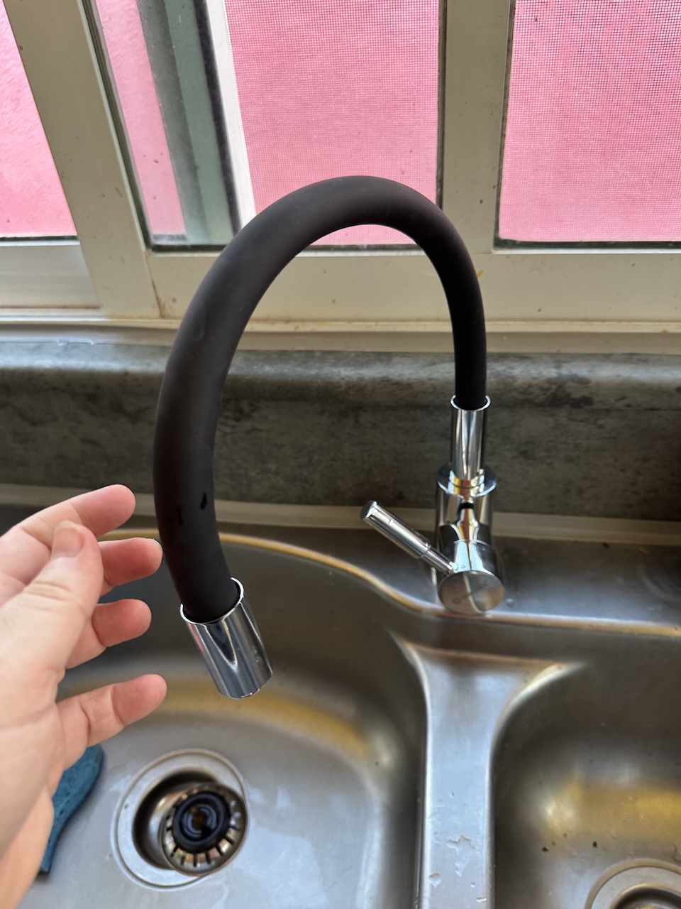 I made another upgrade to the kitchen. I gave up on having a fancy faucet with a spray hose because there just isn’t enough pressure. I’d tried installing a pressurizing pump, but it kept jamming up with sarro. After searching for a compromise, I found this inexpensive faucet on Amazon that was the answer I needed. I lost the spray feature, but I still have the flexibility of a hose.