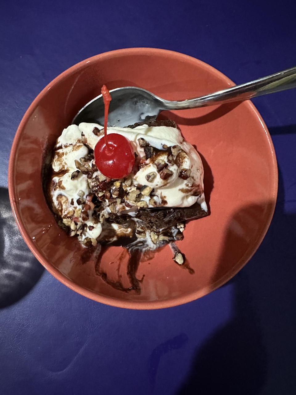 I ordered dinner late in the month and added a brownie for dinner. Was I surprised when it came with ice cream and toppings! I love it when restaurants go the extra mile like that. Yum!