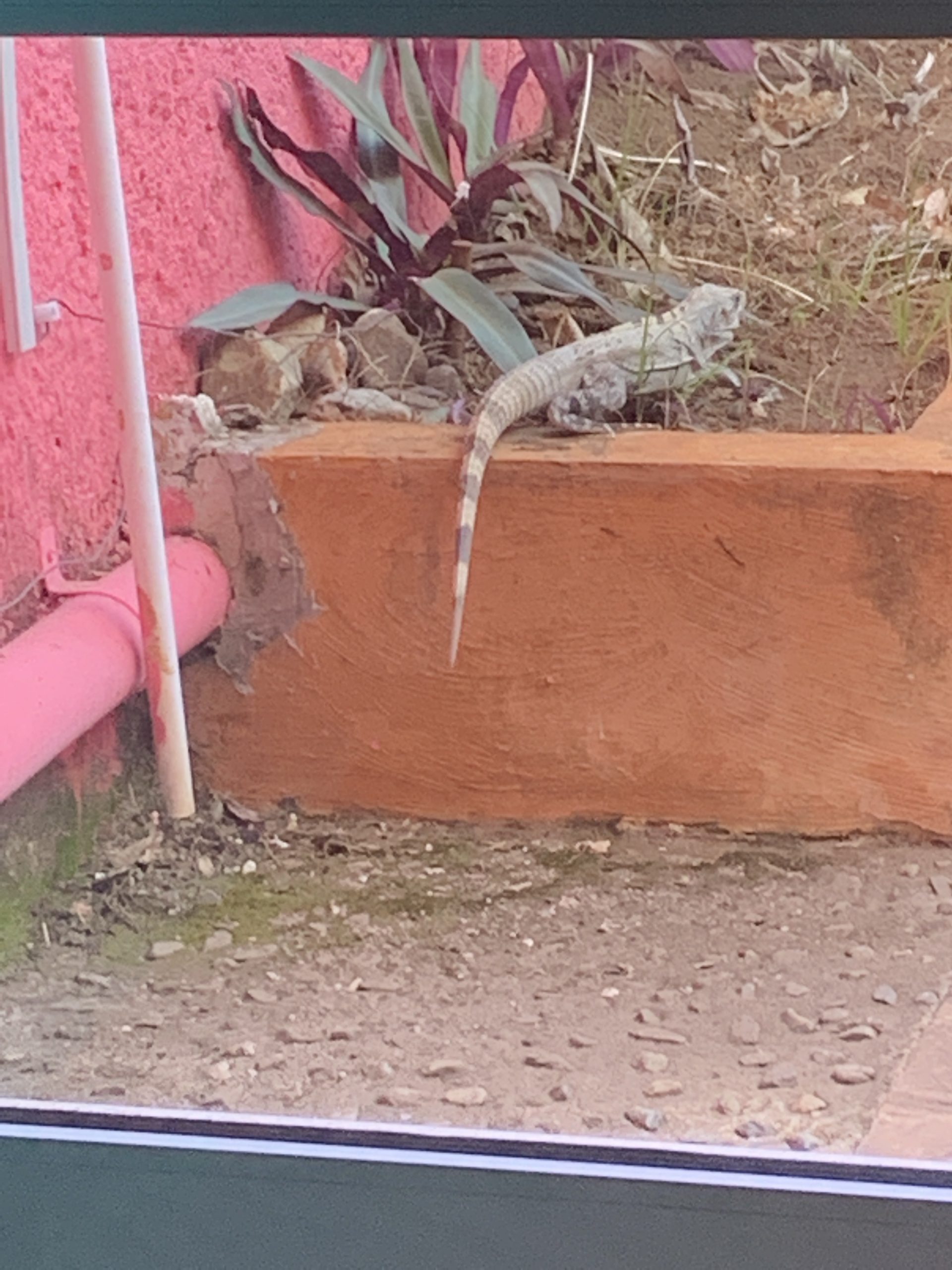 Happy with the beefed up security, I went back to work feeling a tad more relaxed, when I suddenly heard knocking at my exterior office door. I think my heart stopped for a couple of beats! I finally turned to see what was there, just in time to see this adorable guy literally tapping on the glass with his paws, freeze when he saw me, and then run off! Wonder if I could train my iguanas to fight off intruders!