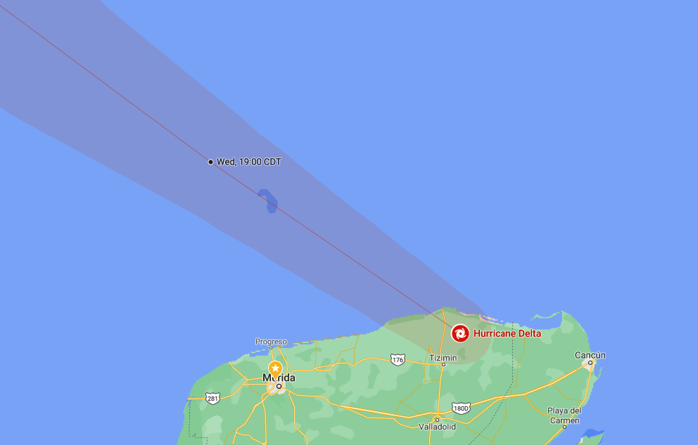 After being dumped on by Tropical Storm Gamma, Yucatán is being walloped by Hurricane Delta. As of 11:08 CST on October 7th, here’s Delta in relation to me.