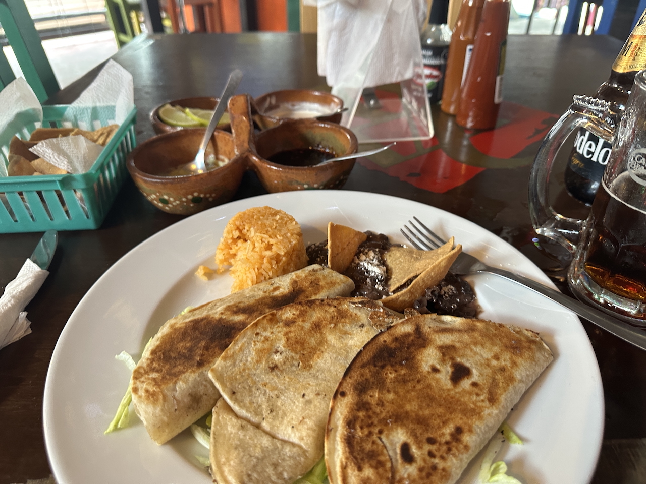 They only had three beer options, with thankfully Modelo Negra being one of them. I was feeling snack-ish, pondered the quesadillas, and finally decided to ask for them with shrimp, even if shrimp quesadillas are generally not great out here compared to on the Pacific. At one point, I heard the abuelita cooking ordering the sous-chef to add rice and beans to my plate because I was “nearly a Mexican and would expect them”! So my snack ended up being a giant platter of the best quesadillas I’ve had since I last had some in Mazatlán. :O WHERE did she find such sweet shrimp?! I was just missing pico, but there were plenty of delicious salsas to dress them up. I didn’t care that I paid $350 (including a very generous tip) for these, they were worth it and tasted like Home.