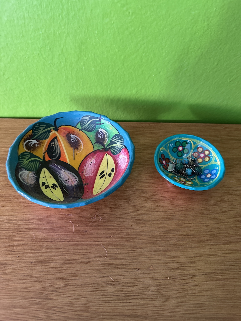 Here is my little bowl from Chichén Itzá next to a larger bowl that was a gift from Contessa (no, my walls are not neon green — my iPhone camera is a menace!).