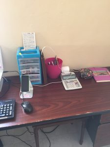 The main part desk has two holes through which I can pass cables and the peninsula has one, bliss. So one hole goes to my computer and the other to my calculator and iDevices for recharging. I’ve still got a mess of cables to corral, but you’ll have to trust me that this is way better and more functional even like this than what I’ve had in the last year!