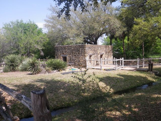 This gristmill still works. The ditch is called an acequia, a technologically marvelous technique of diverting water from the San Antonio river to irrigate fields with no loss of water pressure. Here, the acequia is full of recycled water.