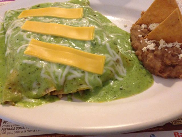 As suspected, they were quite different, with the English menu omitting many of the Mexican dishes and adding more American dishes. The average price point on the English menu was also higher than on the Spanish one. I ordered the chicken enchiladas with creamy green sauce from the Spanish menu, hoping that they would be similar to the ones I had in Texas.